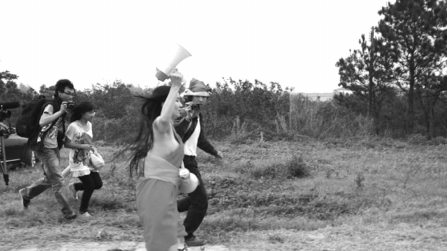 争议极大的裸体行为艺术家海容天天再度出山,她身着各色布条,胸前挂着扩音器一路狂奔,近百人紧跟其后。在跑动的过程中,她褪去自认是累赘的衣物,最后一丝不挂地坐在河边,不紧不慢唱起歌来